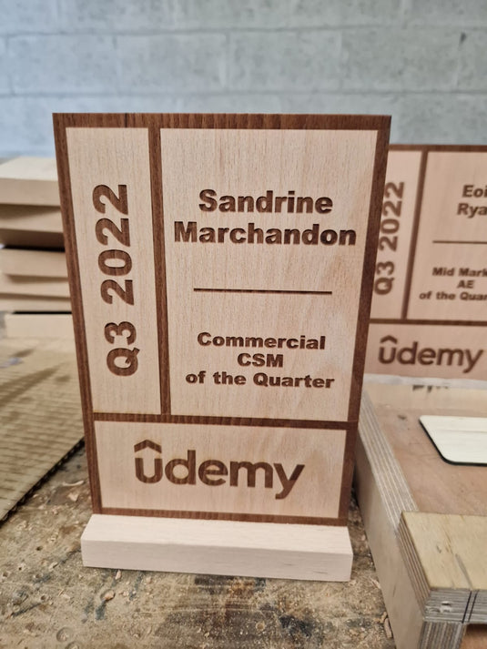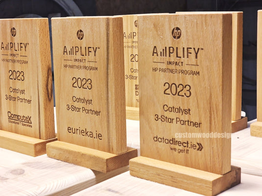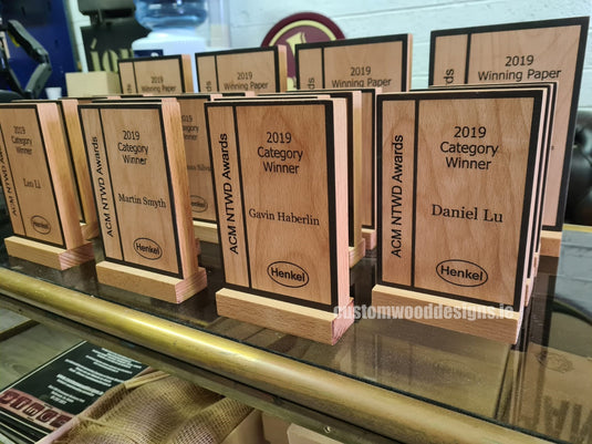 At Custom Wood Designs Ireland, we create all-natural wooden award plaques that beautifully combine sustainability, craftsmanship, and personalization. Made from FSC-certified premium European hardwoods, each plaque is a testament to eco-friendly design and the timeless elegance of natural materials. Our dedication to quality ensures every piece is crafted to perfection, making it an ideal choice for corporate recognition, special events, and bespoke gifting.