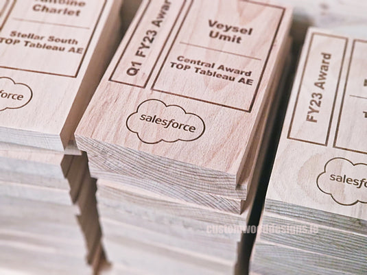 A: Custom Wood Designs offers a wide range of trophies and awards made out of wood or partially from wood. Our offerings include engraved plaques, acrylic awards with wooden accents, wooden trophies, and custom-designed awards.